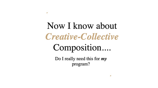 Summer Webinar Series on Creative Collective CompositionIntroducing a Series of 4 Webinars on Creative Collective Composition Collective Composition is a unique and engaging way to incorporate more creativity into intensive music education settings. Through Collective Compositions,…